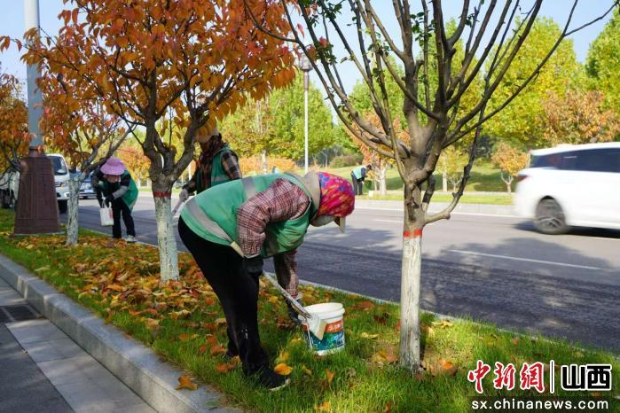 中新网山西新闻11月6日电 随着气温逐渐下降,树木开始进入冬季生长休眠期,为增强树木抗寒、防冻、防虫能力,近日,山西长子县抢抓晴好天气,组织园林工人全面开展冬季树木涂白工作。街道两旁、公园广场各处绿化带中的树木陆续换上整齐划一的“白色新装”,成为冬日街头一道清新亮丽的风景线。