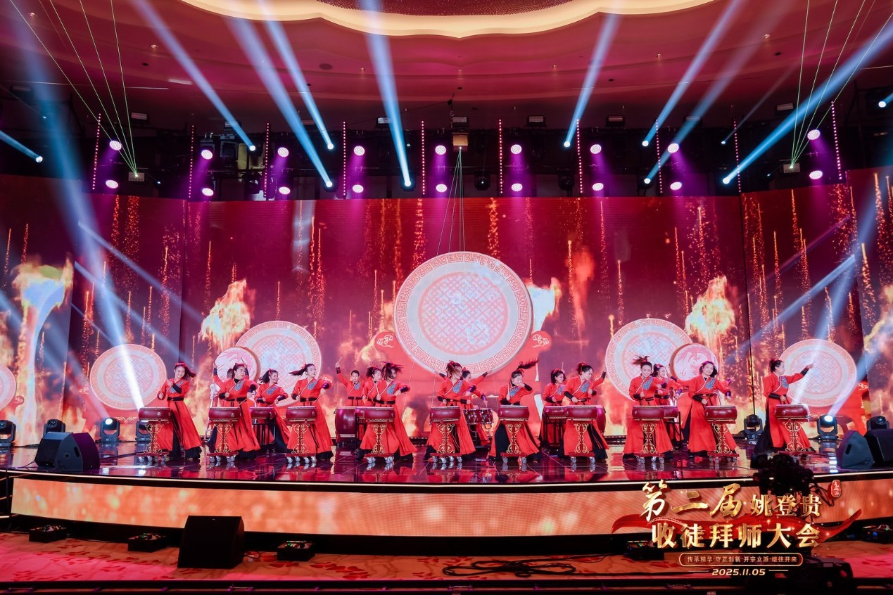 绛州鼓乐《鼓舞龙腾》大会分以传承精华、守正创新、开宗立派、继往开来为主题,通过文艺表演、古礼仪式、学术发言等多样形式,立体展现中医气血疗法的传承脉络与时代价值。山西新绛县带来的国家级非物质文化遗产绛州鼓乐《鼓舞龙腾》拉开序幕,气势磅礴的鼓乐贯穿全程,既呼应姚登贵先生的家乡情结,又彰显中医文化的厚重底蕴。
