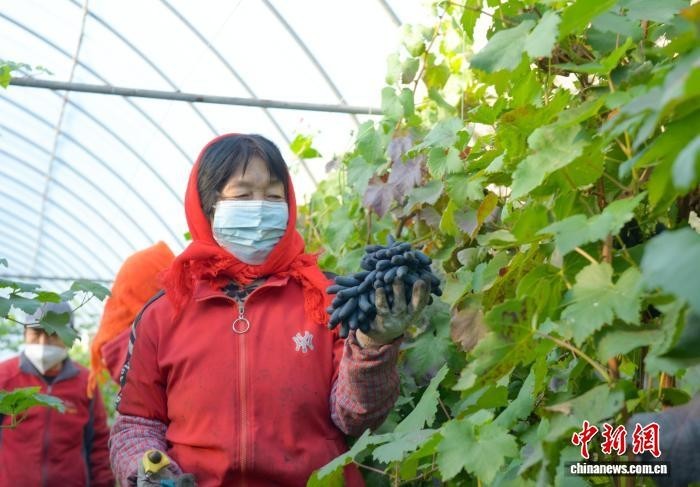 村民正在采摘葡萄。 赵彦杰 摄葡萄藤蔓下,英明6号、9号以及蓝宝石等品种的葡萄令人垂涎欲滴。合作社技术员赵井强介绍,大棚采用科学的种植管理技术,保证了葡萄的绿色、安全与高品质。
