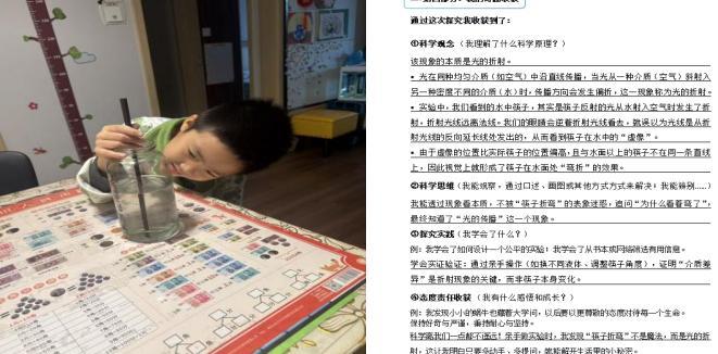 青年路小学教育集团诚光分校一年一班胡茗烁同学从“人骨与鱼刺的差异”这一独特视角切入,以超市观察为起点,综合实地体验、资料查阅、3D模型制作等多种方式,梳理出“本质、位置、功能、进化”的对比体系,既揭示了“人类从鱼进化、骨骼适配生存环境”的科学逻辑,更充分展现了“从生活现象到科学本质”的探究能力。郝伯锟同学从厨房飘来的香味中捕捉到了科学问题:“为何在客厅也能嗅到厨房炒菜的香气?”在妈妈的协助下,他进行了一个直观的实验:将色素分别滴入热水和凉水中,观察到“色素在热水中扩散速度明显更快”。“原来香味是菜里的分子受热跑出来了!”同班的郝航宇同学则对餐桌上的筷子产生了好奇:“筷子为何会在水中呈现‘弯折’现象?”通过实验和查阅资料,他终于揭开了谜底:这是“光的折射”现象——光从空气进入水中时会改变方向,因此我们眼睛所看到的筷子其实是其“虚像”。“原来不是筷子弯了,是光在‘骗’我们!”