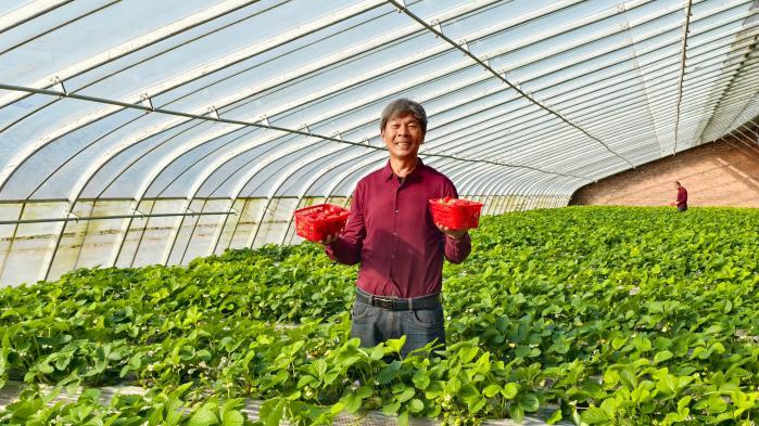 棚内还配备了数字化智能系统,实现高效无土栽培与远程智能管理。通过手机即可操控新式卷帘机,自动完成通风、保温等操作,实时监测调节温湿度和光照。同时,使用净化水设备浇灌和水肥一体滴灌系统,不仅实现了节水节肥、省工省力,也使草莓更加鲜亮香甜。