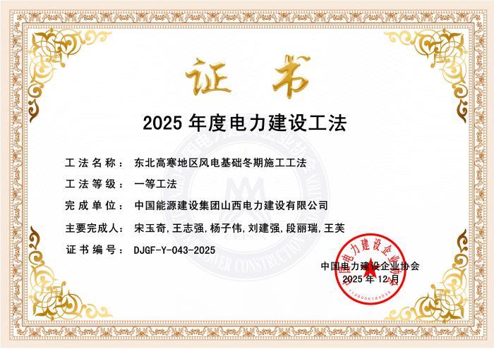 其中,《东北高寒地区风电基础冬期施工工法》荣获2025年度电力建设工法一等奖,该工法针对高寒地区冬季施工难题,采取差异化保温蓄热措施,最大限度利用混凝土自身水化热并辅以外加热源,确保混凝土始终处于强度发展的温度区间,有效预防冻伤与温度应力裂缝,系统解决了高寒地区风电基础冬季施工中的保温、模板稳定及效率问题,显著提升了工程质量与施工安全性。