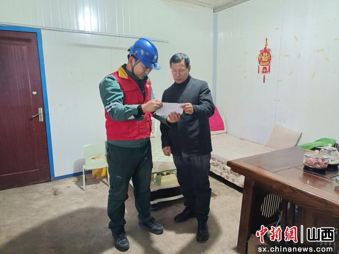 中新网山西新闻1月19日电 近日,国家电网山西电力(临汾)太行黎明共产党员服务队员李国江和青年突击队队员李璟龙走进山西临汾东台神村民许金元家中开展上门服务。这是临汾供电公司开展“抗寒潮、保供暖”前置服务专项行动中的一个生动场景。