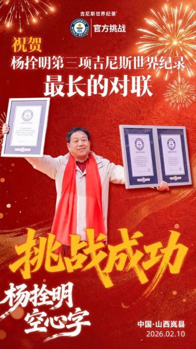杨拴明的创作历程,从2019年书写“最长的毛笔空心字”,到2022年创作“最多的组合字书法”,再到此次在小年完成“最长的对联”,三次获得吉尼斯世界纪录。