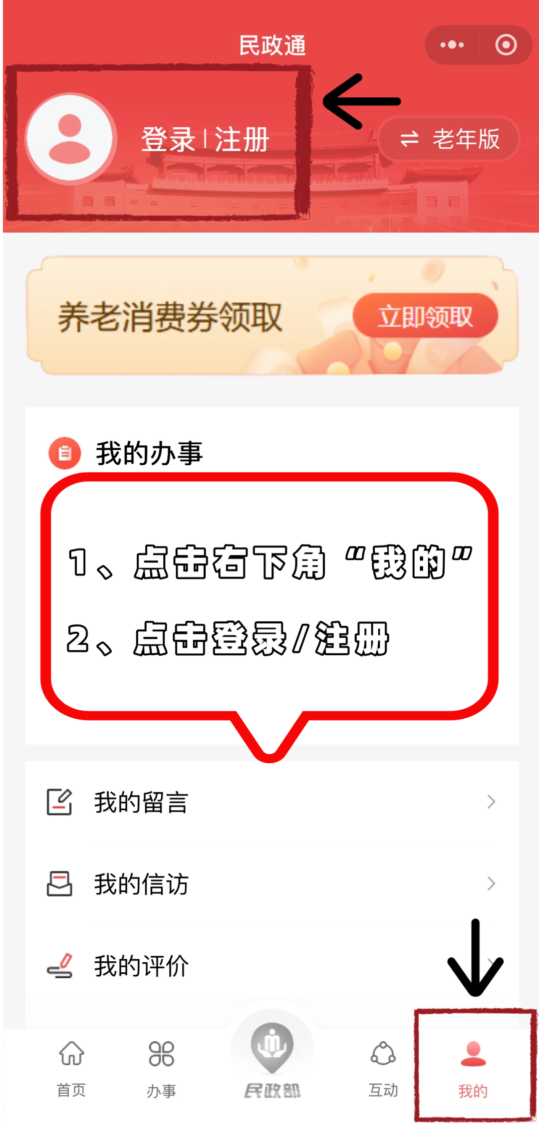 打开“民政通”App或小程序完成注册,成功登录后,进入主页。