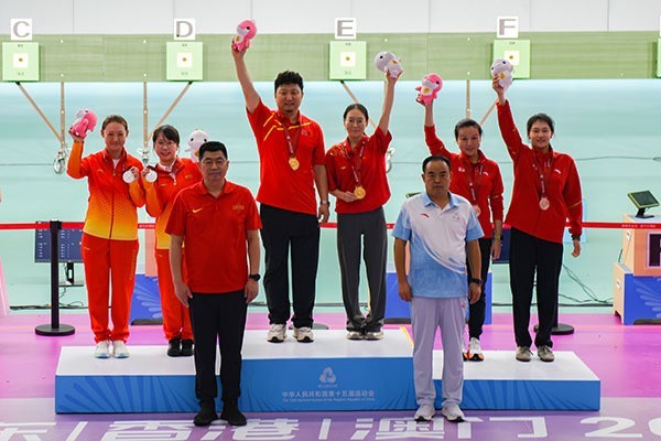 全运会陈妍(后排右三)登上冠军领奖台回顾过往,山西射击已走过70年峥嵘岁月。1956年,山西省第一届射击大会在太原拉开帷幕。三年之后,第一届全运会的赛场上,李富囤在创纪录赛的军用步枪3×20项目中跻身运动健将。1960年,山西省射击队正式成立,山西射击从此迈入专业化发展阶段。
