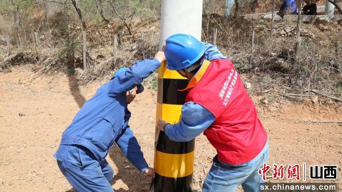 中新网山西新闻3月11日电 近日,国网长治市潞城区供电公司党员服务队员来到10千伏合室571线路开展跨林区线路巡视的同时,对道路两侧及田间地头电杆拉线加装反光贴,筑牢防外破“安全网”,确保电网安全可靠运行。