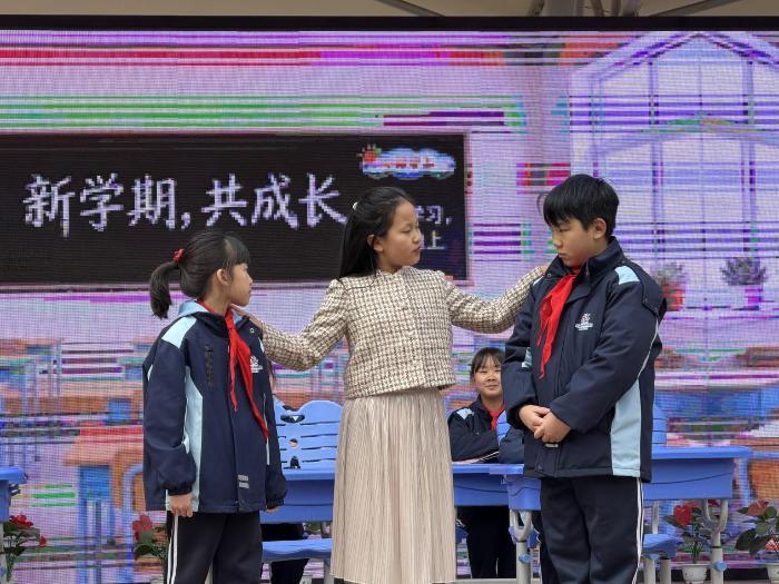 “小小的教室,就是我们的‘方寸天地’”。校会上,四二中队的学生们带来了一场精彩的情景剧。故事从一支不小心被碰坏的新画笔开始,引发了同学间的小矛盾。在“高老师”的耐心引导下,同学们从委屈、生气到理解、包容,最终用真诚的道歉和具体的行动化解了误会。