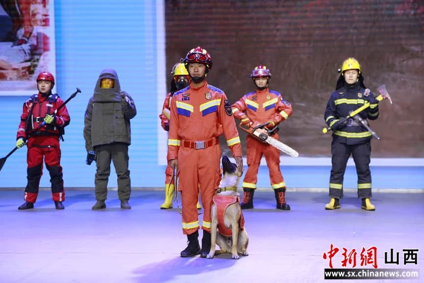 紧接着,两位特殊小“嘉宾”一出场,全场欢呼声就没停过。搜救犬荣耀和闪电站在台上,乖得像两个小战士。2岁的荣耀是个冠军犬,全国搜救技能大赛闯进了前十名,山西省里的比赛直接拿了第一名;4岁的闪电更是经验丰富的老兵,去年某小区爆炸事故中,它第一个冲进现场救人,省级比赛也拿了第四名。