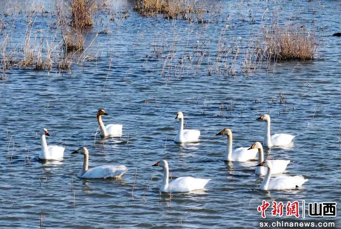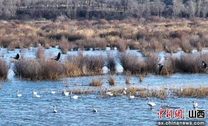 中新网山西新闻3月27日电 春潮涌动,冰河初开。在山西大同市新荣区赵家窑水库上游的淤泥河湿地,成群的大天鹅如约而至,它们或悠然游弋于碧波之上,或振翅翱翔于晴空之间,为这片塞北湿地绘就了一幅灵动的生态画卷。