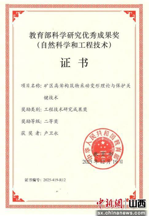 中新网山西新闻1月5日电 近日,教育部公布2025年度科学研究优秀成果奖(自然科学和工程技术)获奖名单,吕梁学院资源与机械工程系副主任卢卫永副教授作为主要完成人参与完成的“矿区高耸构筑物采动变形理论与保护关键技术”项目,荣获工程技术研究成果奖二等奖,为山西高校赢得了荣誉,显著提升了山西省矿山安全学科在全国同类学科中的影响力。