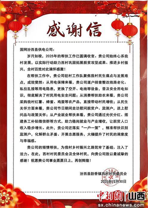 中新网山西新闻1月6日电 近日,山西临汾汾西供电公司收到了一份满载温情的特殊礼物——汾西县勍香镇西村村民委员会送来的感谢信。信纸之上,朴实的文字诉说着全村百姓对该公司一年来帮扶工作的感激之情,也勾勒出电力力量助力西村巩固脱贫成果、推进乡村振兴的生动图景。