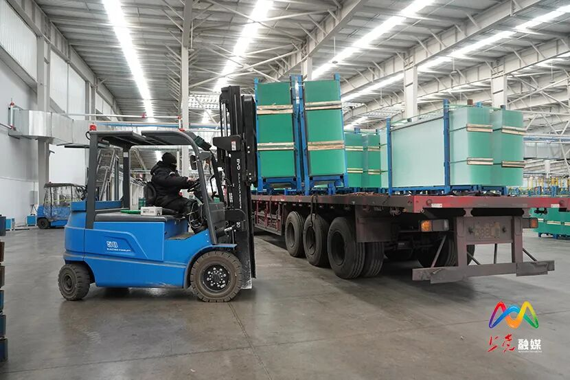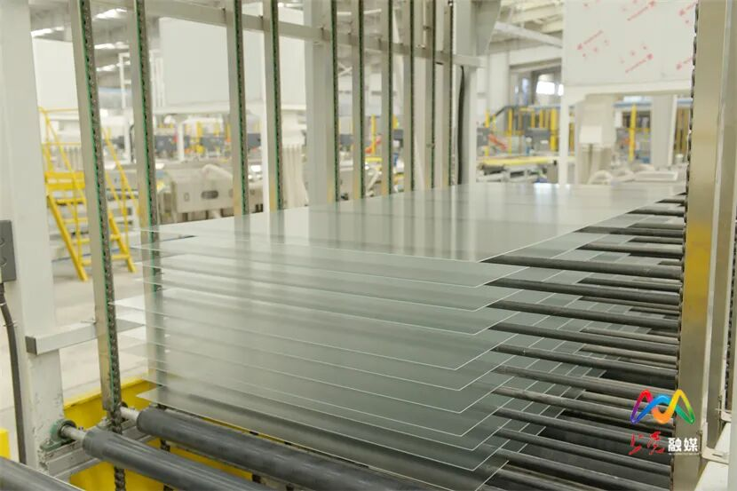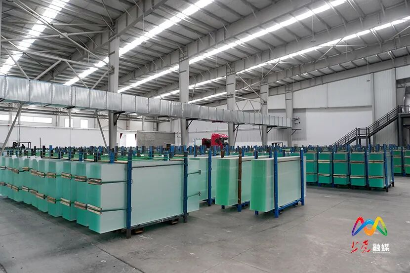 目前,日盛达光伏材料二期项目的两条钢化生产线已稳定投产。在二期项目生产车间内,长达300余米的智能化生产线高速运转,超白压延光伏玻璃以每分钟16片的速度高效产出。这种厚度仅为2毫米的特种玻璃是光伏组件的关键封装材料,涵盖盖板光伏玻璃与背板光伏玻璃两大类,高度契合当前光伏产业发展需求,市场前景广阔,为推动区域光伏产业集聚、完善产业链提供了有力支撑。日盛达光伏材料有限公司副总经理李丽清介绍:“2025年3月,日盛达15GW光伏电池高透封装材料项目竣工,5月正式投产。2025年公司销售收入达1.5亿元,所生产的高透封装材料主要用于光伏组件的上下封装及双玻组件的封装。”