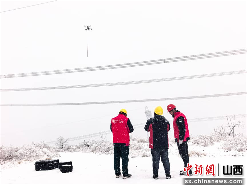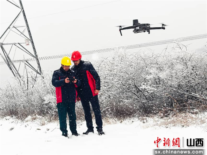 闫碧岑 摄1月19日,山西省阳泉市盂县地区迎来降雪,国网山西超高压输电公司输电运检三分部工作人员在500千伏温卧一二线利用无人机开展防覆冰特巡,全面关注线路情况,保证线路安全稳定。(完)