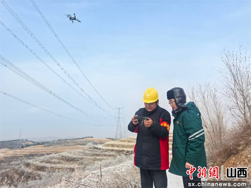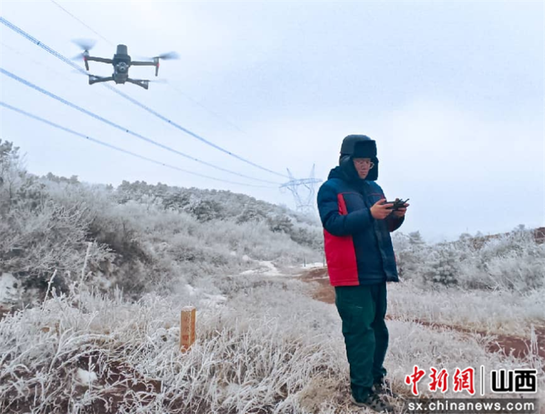 董辉 摄1月19日,山西省长治市,国网山西超高压输电公司输电运检四分部班组人员利用无人机对1000千伏长南一线开展防覆冰巡视,排查线路隐患,全力保障大电网安全运行。