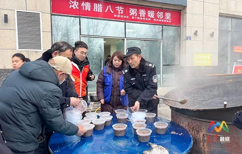 腊八节当天,上党区韩店街道黎都街社区联合第十网格党支部、银河湾恒御物业,在银河湾小区开展“我们的节日·腊八节”主题活动,为小区居民及周边环卫工人免费送上温热的腊八粥,用传统节日的温情驱散冬日严寒。